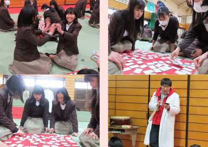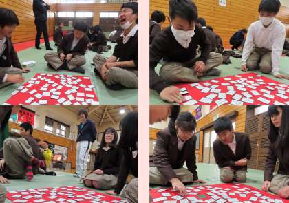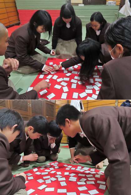 百人一首大会の様子です。読み手は、先生が順番に行っています。