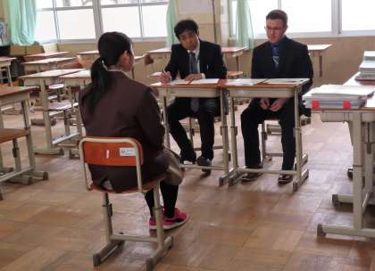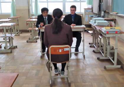 3年生のテスト終了後に、英語面接がある子どもたちの面接練習が行われました。ALTの先生が面接官になり行われていました。