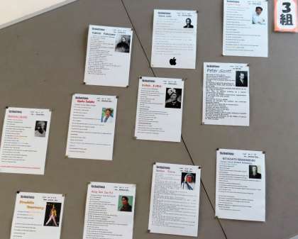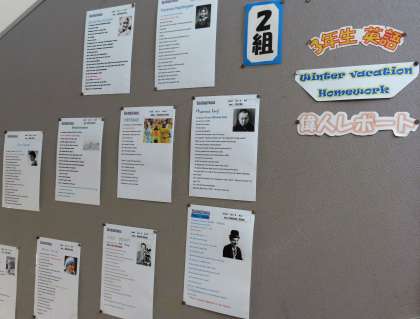 3年生英語科の冬休みの課題(偉人レポート)が掲示されていました。