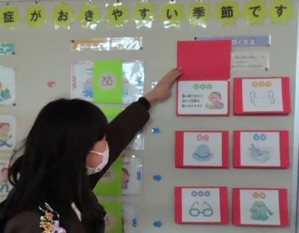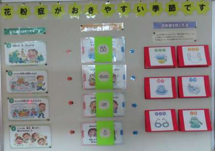保健室前の掲示物が、新しくなりました。「花粉とカゼの見分け方」や「花粉症を防ぐ方法」などです。