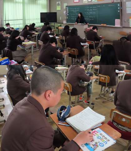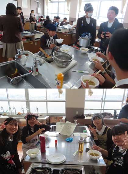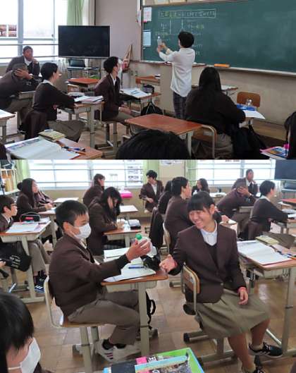 2限の授業の様子です。上から、2組 理科、3組 家庭、4組 英語 です。2年3組の調理実習では、豚汁を作っていました。