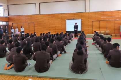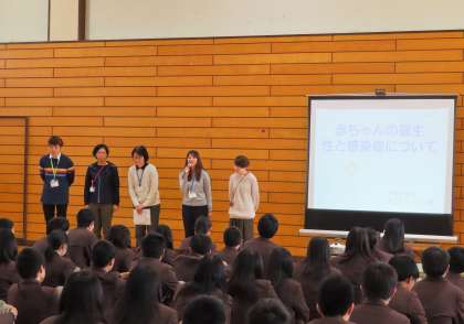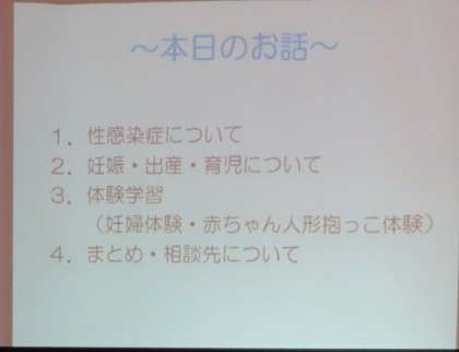 3年生は本日の5、6限に伏見区役所(伏見保健センター)子どもはぐくみ室より4名、伏見青少年活動センターより1名の方に来ていただき、思春期健康教室を行いました。始めに、来て頂いた方の紹介後、導入に男女交際について話があり、今日の流れの説明がありました。「HIV・エイズ・性感染症についての講話」「妊娠・出産についての講話」「赤ちゃん人形の抱っこ体験学習」を行います。