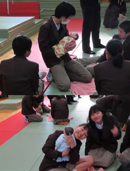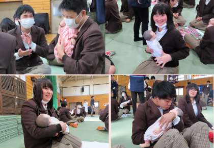 思春期健康教室・赤ちゃん人形の抱っこ体験の様子です。