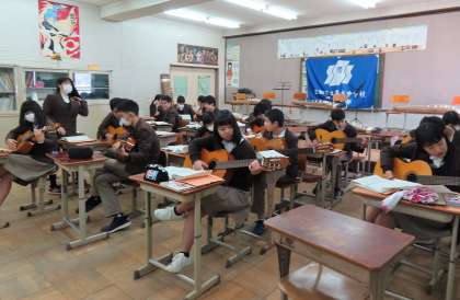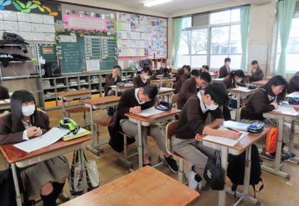 2限の授業の様子です。上から、2組 社会、3組 音楽、4組 理科 です。3年生は公立前期選抜学力検査2日目です。