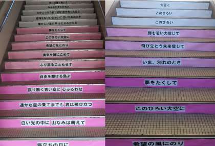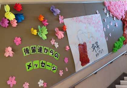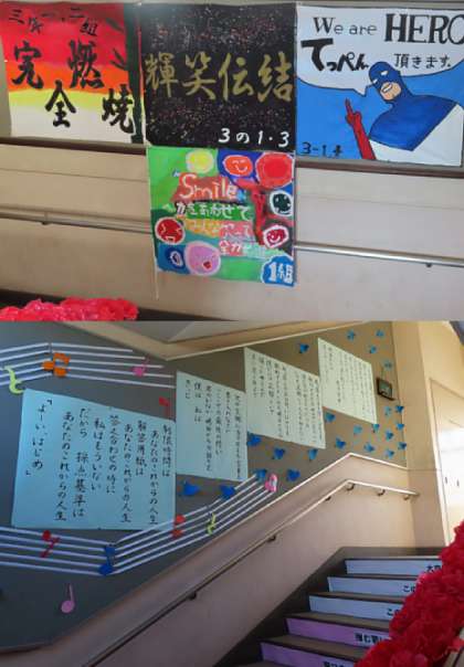 この後、卒業生は教室から2階の体育館へ向けて移動し、式場に入場します。式典が制限される中、3年の教職員を中心に教室から式場までの飾り付けをしてくれました。3年生が教室を出ると廊下には「京都市長や教育長、PTA会長の祝辞」、階段には「在校生からのメッセージ」「式の中で歌うはずだった『旅立ちの日に』の歌詞」「各クラスの学級旗」などが飾られています。