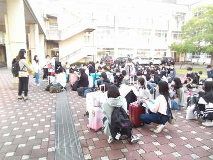 爽やかな晴天に恵まれ、修学旅行当日を迎えました。生徒集合は、6時25分です。いつもよりはかなり早い時間ですが、遅れずにしっかり集合ができました。