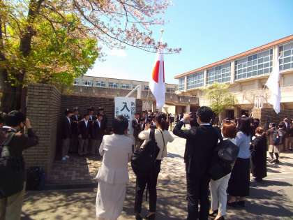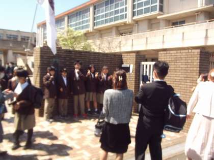 学活の後は、正門付近で記念撮影です。雲ひとつない晴天の中、とても爽やかな笑顔が印象的でした。