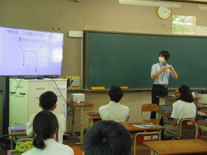 5、6限に高校出前授業を行いました。公立高校の概要説明について、リモートにより各教室へ配信をしました。また、洛水高校より3名の先生をお招きし、体験授業を行いました。