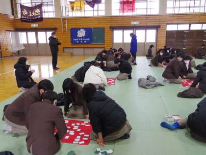 25日(水)2年生百人一首大会を開催しました。本日は大雪のため天候も悪く、防寒対策もしながら実施しています。会場は寒さに負けず、熱心に取り組んでいました。