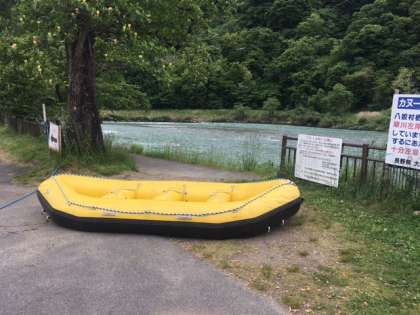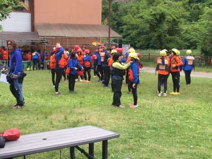 川の駅さざなみ(大町市)に到着し、集合写真の撮影後、犀川ラフティングを行います。みんな元気いっぱいです。