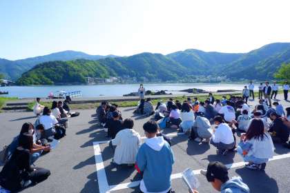 河口湖にて、退村式と昨日の振り返り、今日の予定を確認しました!今日は自分たちで活動する1日です。無事に安全に過ごしましょう!