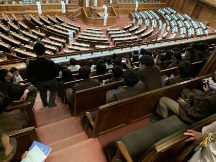 大会議場の説明を聞きを終えて、議事堂内を見学しています。