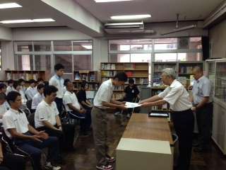 9月1日(日)本校の図書室にて、12月25日より開催される、JOCジュニアオリンピックカップ第27回全国都道府県対抗中学バレーボール大会の京都府選手団の結団式で認証状を京都府バレーボール協会会長から本校Y・Nくんが受け取りました。本大会での活躍を期待します。