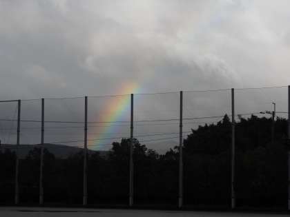 本日の朝、台風が過ぎ、まだ風が強いものの曇天の中に虹。そして、緑のカーテンの西洋朝顔も大きな花を咲かせていました。明日は学校祭文化の部。舞台発表・展示ともに、今まで準備してきたものをしっかりと発表してほしいと思います。