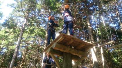 体験学習のスカイアドベンチャーです。地上6メートルを命綱をつけて進んで行きます。