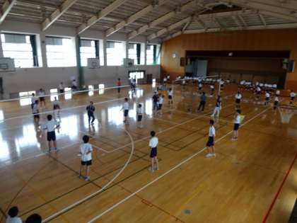 2年生は、体育館にて学年レクレーションとして、先日まで体育の授業で行っていたバレーボールを実施しました。昼からの取組で暑い中でしたが、チームプレイということもあり、一つ一つのプレーに歓声が沸きあがり、盛り上がった雰囲気で行われていました。