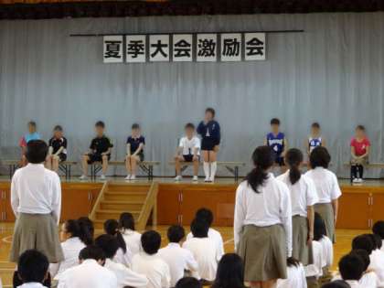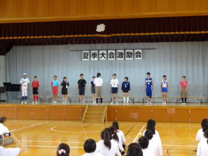本日、夏季大会 激励会が行われました。吹奏楽部の演奏で選手が入場。各部活動の代表選手から、夏季大会に臨む決意が述べられました。引き続き、生徒会長の杉森さんと学校長から激励の言葉がありました。 夏季大会は1年間、部活動で積み上げてきた成果を発揮する場であり、府大会、近畿大会、全国大会とつながっていきます。部活動に入っている目的はそれぞれ違うものがあるかもしれませんが、これらの大会を目標に、自らの体を鍛え・技術を磨き・多くの経験を積み重ね、精神的にも鍛え、同じ目標を持つ仲間と一緒に乗り切ってきたはずです。保護者の方をはじめ、多くの人の支えがあって大会に挑める感謝の気持ちを持って、思いっきり試合に臨んでほしいと思います。