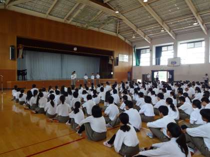 ピアノの前奏に続いて、校歌を全員で斉唱し、集会が始まりました。