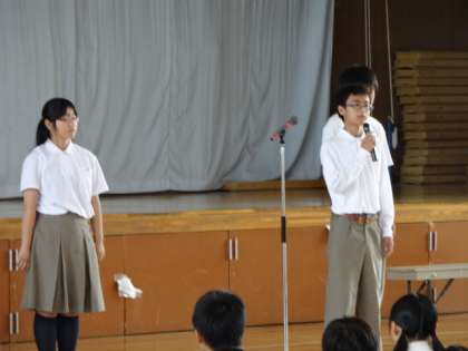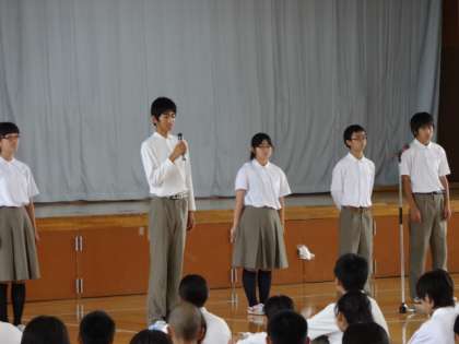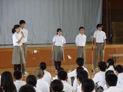 生徒会からは、生徒会長・体育委員長・環境委員長・保健安全委員長・図書委員長らがそれぞれの行ってきた内容と夏休み・夏休み明けの取組みについての話をしてくれました。
