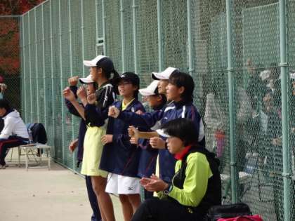 11月8日(土)・9日(日)と丹波自然公園テニスコートで8日団体戦・9日個人戦が行われます。この大会は京都市から5校山城地区4校・口丹波・中丹・丹後それぞれ2校前年度優勝校と各地区で勝ち抜いてきたチームが集まり行われる大会です。早朝の丹波自然公園は、かなり冷え込んでいたのですが、その寒さを吹き飛ばすくらいの気合いあふれる選手たちと元気いっぱいに応援する選手たちで会場は、まさに熱気にあふれていました。