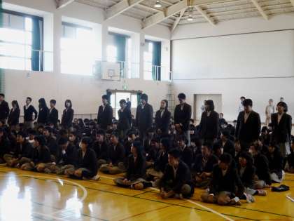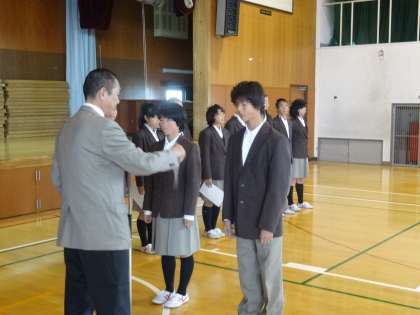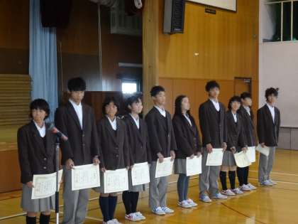 11月11日(火)6時間目 体育館にて 認証式が行われました。先日行われた選挙の結果を受け、新生徒会本部役員に校長先生から認証書が渡されました。その後、旧生徒会本部より旧生徒会長が代表してあいさつをし、新生徒会長より新生徒会本部のあいさつがありました。生徒会本部の引き継ぎが重なり、より大きな力となっていってくれればと思います。各クラス後期の代表委員・専門委員を代表して2年3組の生徒が校長先生から認証書を渡されました。各役割をしっかり果たし、また、周りの人もしっかり支えながら、洛水中学校の生徒全員が、生徒会本部・代表委員・各種委員・クラスメイトとしっかりスクラムを組んで、すばらしい学校生活を築いていってくれることを期待します。