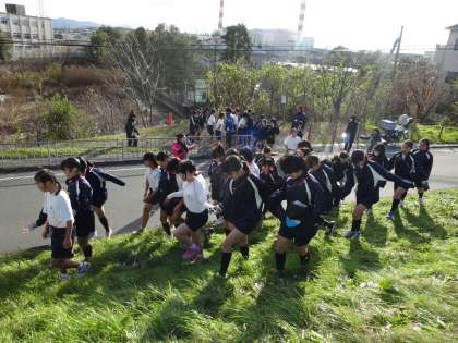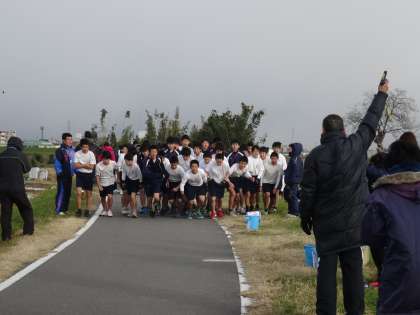 12月18日(木)小雪舞う中、校内マラソン大会が実施されました。寒波による非常に厳しい朝でしたが、格技室で諸注意を受けた後、中庭で準備体操を行い、堤防のスタート地点に向かいました。
