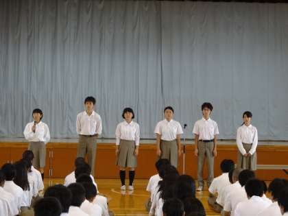 生徒会長より「エコキャップ運動」のお礼と感謝状贈呈と各委員長から夏休み明けに行う「生活向上週間」に向けての報告がありました。