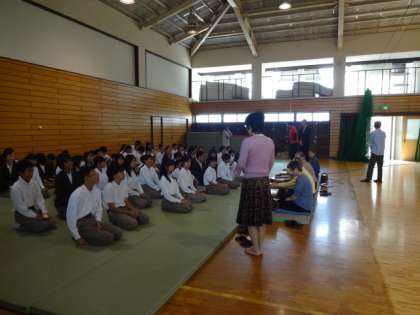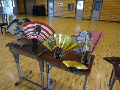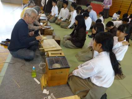 10月14日水曜日 格技室にて 1年生は、本物の伝統工芸品に触れることを通して、京の伝統工芸品に対する理解を深め、文化や伝統を尊重する態度を育成するため、京都扇子団地扇商工協同組合の方々に来校して頂き、京扇子の作成をしました。