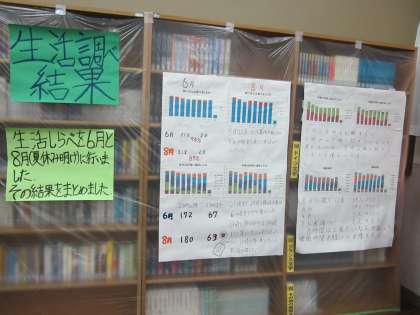 図書室にて、図書委員会から「おすすめ本&POP」と保健安全委員会による「生活調べ・洛水パラダイス」の展示がありました。