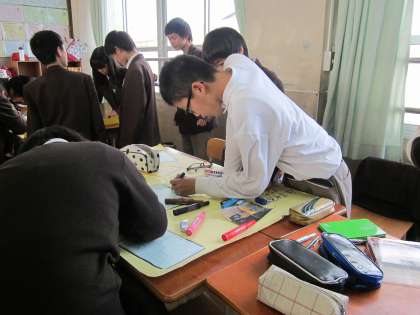 生徒たちは、校外学習で興味を持ったことを調べ、ポスターに書き込んだり、感想を書き込んだりしながら、班で考えながらまとめていました。このような取組が、今後授業の中でも行われるようになり、自らの考えをまとめ、意見交流し、学びを深めていくアクティブラーニングにつながっていくことかと思います。