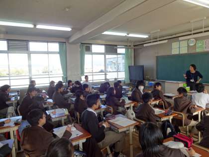 1年生では、「こんな私になりたい」を題材に、キャリアの視点から、夢の実現には、それ相応の努力が必要。簡単にいかないのも現実。挫折を感じながらも、粘り強く生きていく力をつけていってほしい。ライフプランや仕事観、今の自分・5年後の自分など、グループディスカッションをしながらすすんでいました。キーワードは「夢の実現」でした。