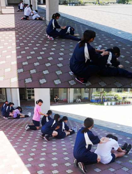体育館で練習できないバドミントン部は、外でのトレーニングです。