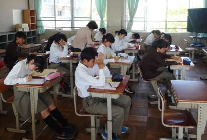 写真は上から、1組、2年2組、3組です。1組では授業が終わり自分たちで終学活の準備をしています。2組は英語、3組は技術(水菜の水耕栽培の実習)です。