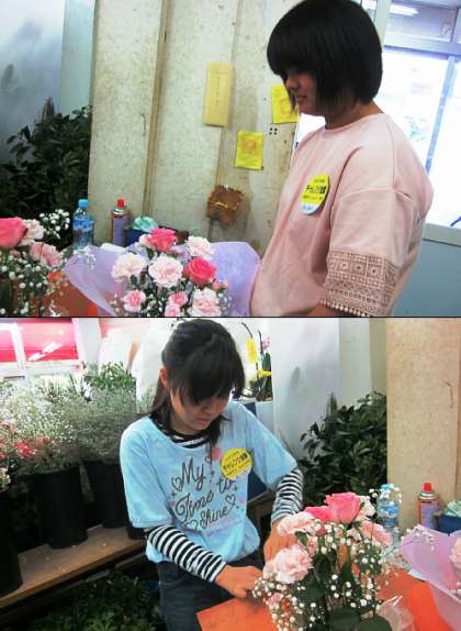 服部花店では、フラワーアレンジメントの練習をさせて頂いたり、くら寿司京都伏見店では普段見えないところでの仕事を頑張っています。