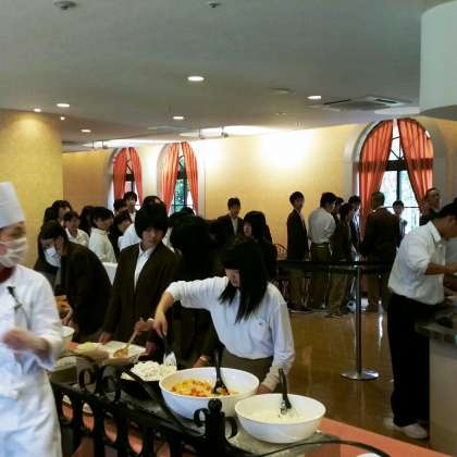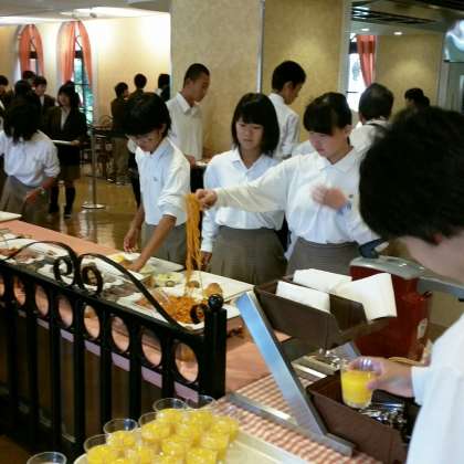 おはようございます。最終日も、子どもたちは元気に起きてきました。朝食の順番を待って、これから朝食が始まります。バイキング形式です。