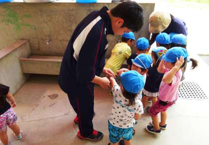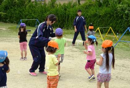 城之内保育園。「蚊にかまれたよ。」「僕も!」と園児に囲まれました。シャボン玉遊びも楽しいです。