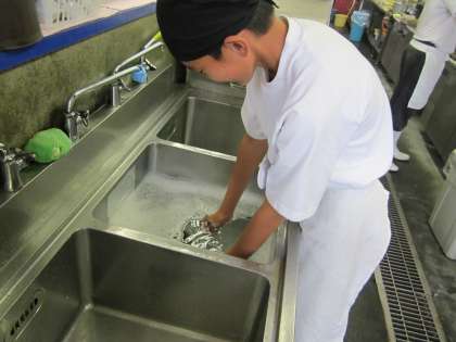 来来亭です。1人は洗い物、1人はワンタンの作成をしています。