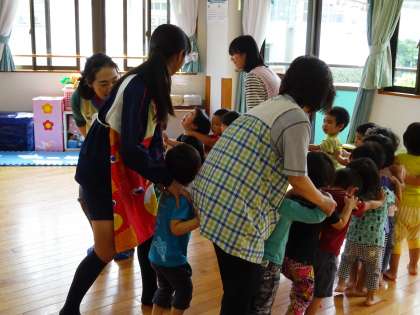 こが保育園。4日間でさまざまな年齢のクラスを体験させて頂きました。絵本の読み聞かせやピアノのリズムに合わせて汽車になるなど、「おねえちゃん先生」頑張っていました!