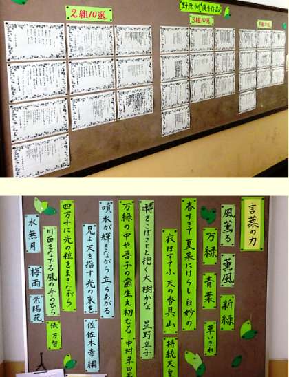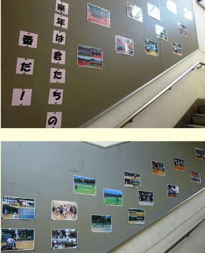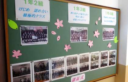 1年生の廊下には、入学したときからの写真や授業の作品、先輩の頑張っている姿の写真などが飾られています。