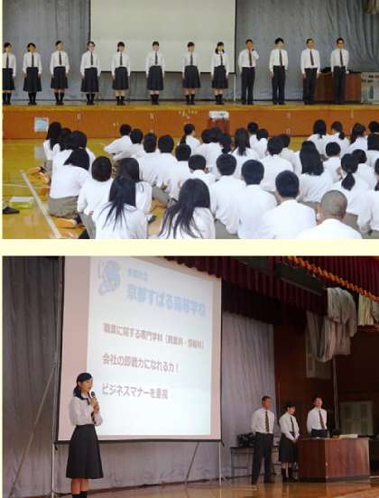 本日6限、京都すばる高校より企画科の生徒さん12名に来校していただき、ビジネスマナー講座を実施しました。社会の一員として必要なマナー、挨拶、受付等の講習の他、進路面接での対応の仕方などを教えていただきました。