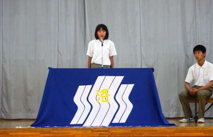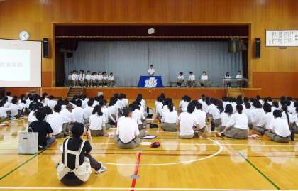 まず始めに、学校生活をより良い生活にするために行われるのは生徒総会で、話や意見を真剣な態度で聞きましょうなどと「生徒総会について」の話が、生徒会長からありました。その後諸注意と採決の仕方についての説明がされ、本題に入りました。