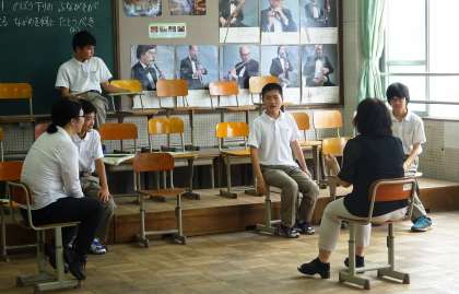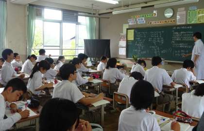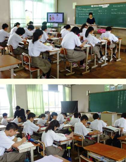上から、2年2組 英語、国語(分割授業)、2年3組 数学、1組 音楽です。