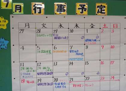 今年度も3ヶ月が過ぎ、昨日より7月です。校内の予定表も新しくなりました。また、右側の配布文書一覧の中に7月の行事予定を掲載させていただいています。ご覧下さい。
