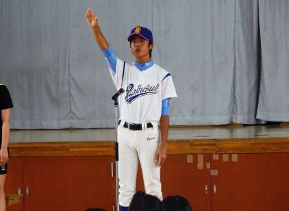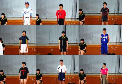 野球部の主将が「今までの努力の成果を発揮できるように精一杯プレーすることを誓います」と元気よく選手宣誓してくれました。その先生を受けて各部のキャプテンから「悔いを残さないように試合すること。感謝の気持ちを忘れずプレーすること」などの決意表明がありました。その後、生徒会長、校長先生からの激励の言葉と続きました。
