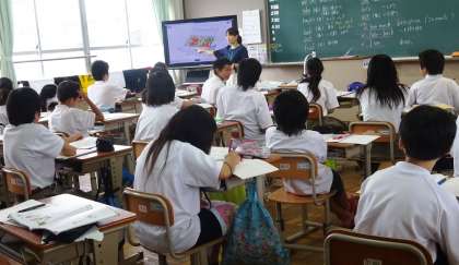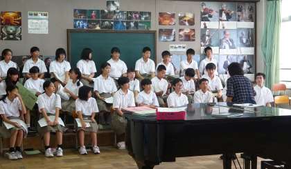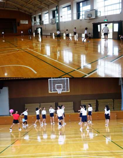 登校時に雨が降り、雷が鳴ったために水泳の授業は体育館ですることになりました。上から、2組 音楽、3組 体育、4組 英語です。
