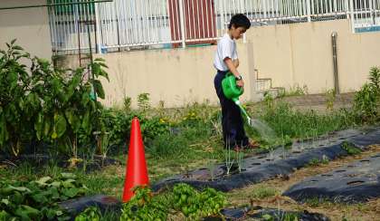 農園芸部は夏休み中、当番を決めて毎朝農園の水やりや校内の花への水やりをしています。暑い中、ご苦労様。
