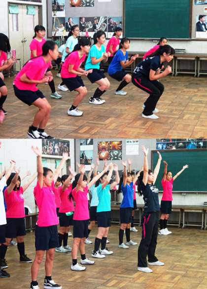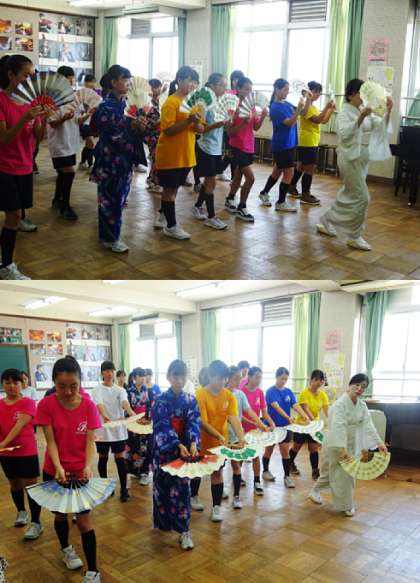 本日(8月5日)の午前中、吹奏楽部は講師の先生に来ていただいて、日本舞踊体験(伝統文化体験)を実施しました。みんな講師の先生の声に合わせて真剣に舞っていました。また、午後からはジャズダンスを行いました。午前中とはリズムが違うので最初は戸惑っていましたが、すぐに先生の動きについて行けるようになりました。