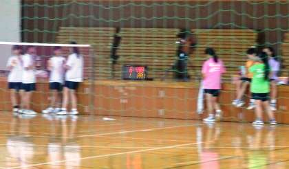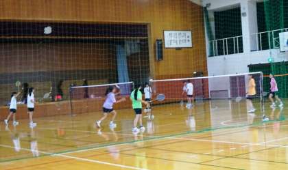 バドミントン部。暑いので休憩をはさみながら練習をしています。