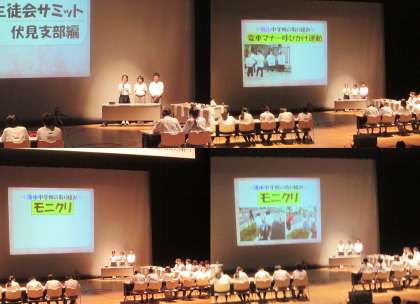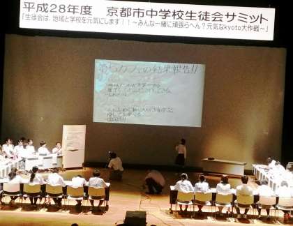 本日(8月19日)の午後、京都市北文化会館にて平成28年度京都市中学校生徒会サミットが行われました。本校生徒会からも伏見支部の発表者とインタビュー役として参加しました。「生徒会は、地域と学校を元気にします!!〜みんな一緒に頑張らへん?元気なkyoto大作戦〜」をスローガンにサミットは行われました。