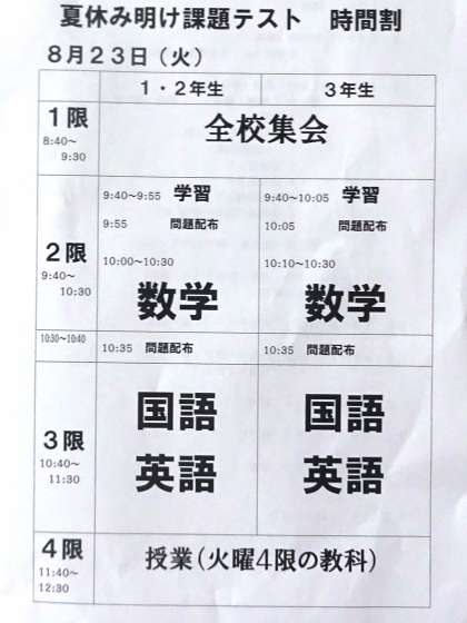 長い夏休みも終わり、8月23日(火)より授業が再開されます。23日はいつも通り(8時20分)の登校になります。下記に予定をあげておきます。ご確認ください。